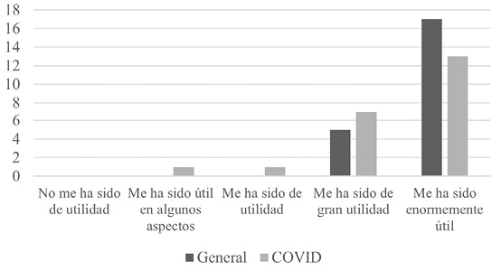 En relación con la situación sanitaria del COVID-19, las medias de los puntajes del grupo USGI rondaron el 4 para las cinco áreas. Comparados con el grupo de control, el grupo USGI obtuvo puntajes significativamente más altos y con un efecto moderado en las áreas de economía, trabajo y familia. Al ser interrogados los miembros de la USGI por la utilidad del budismo —tanto para sus motivos generales como para la situación del COVID-19— la mayor parte de ellos lo consideraron de gran utilidad (Figura 2).