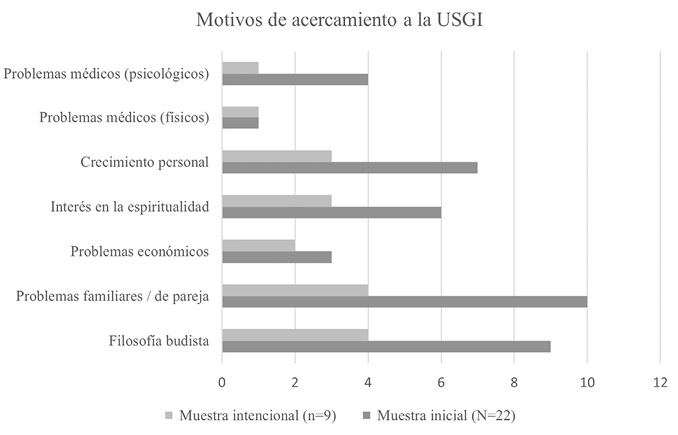 En el componente cualitativo seleccionamos inicialmente 12 casos de los 22 del grupo USGI. En base a un muestreo intencional de máxima variación, subdividimos varios grupos de acuerdo a criterios de sexo, antigüedad en la institución y motivos de acercamiento a la misma, buscando cierta proporcionalidad. Finalmente, y sobre la base de la disponibilidad de los encuestados a una instancia de entrevista en profundidad, se realizaron 9 entrevistas a 2 hombres y 7 mujeres. En términos de antigüedad, 7 eran miembros con más de 20 años en la USGI, mientras que los dos restantes tenían 4 y 14 años de antigüedad. En cuanto a los motivos de participación, buscamos cubrir todas las áreas mencionadas por los participantes (Figura 1).