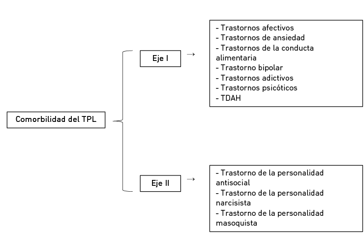 El TPL presenta una sintomatología muy variada, por lo que existe una gran probabilidad de que estos síntomas también aparezcan en otros trastornos clínicos del eje I y del eje II del DSM-5 (ver Figura 1), lo cual puede influir en su curso, pronóstico y tratamiento (Cabeza-Monroy & Palomino-Huertas, 2010; Palomares et al., 2016). La comorbilidad del TPL con el eje II influye negativamente en el curso y pronóstico de los trastornos del eje I y, a su vez, en la recuperación terapéutica del TPL (Palomares et al., 2016).