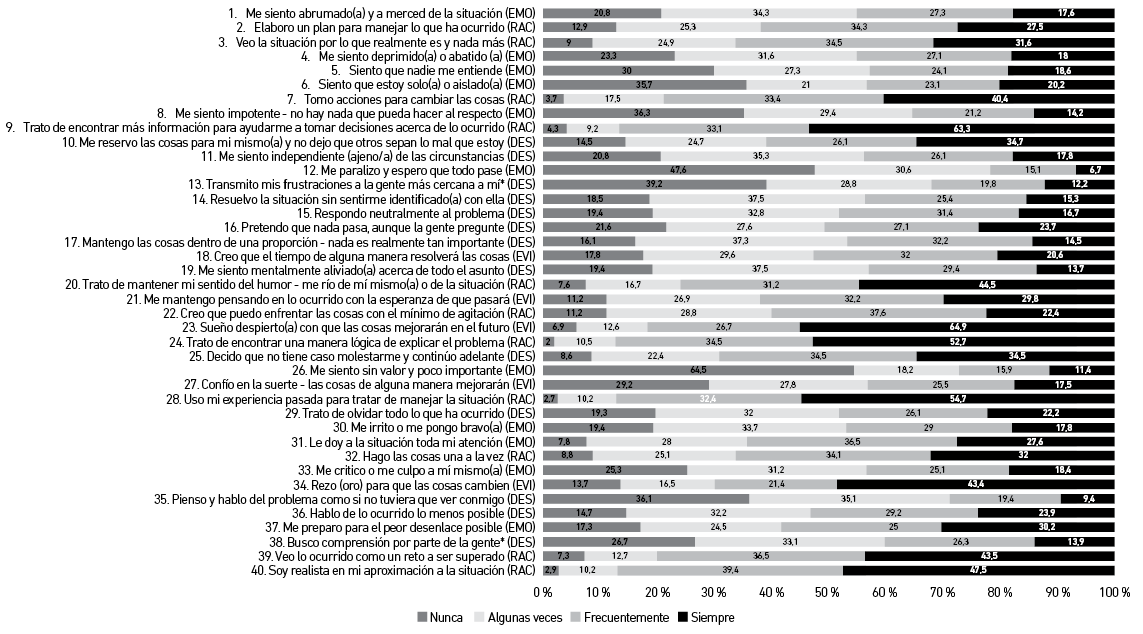 Nota. N = 510. EMO = Afrontamiento emocional, RAC = Afrontamiento racional, DES = Afrontamiento por desapego, EVI = Afrontamiento evitativo. * Los ítems con asterisco son de correlación inversa, es decir, para ellos la respuesta “siempre” es indicativa de un menor nivel de afrontamiento en la dimensión señalada, mientras que la respuesta “nunca” implica un mayor nivel de afrontamiento.