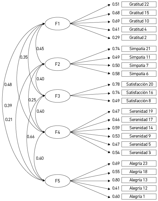Los resultados obtenidos del análisis factorial confirmatorio muestran índices de validez deseables, lo que quiere decir que la teoría subyacente fundamenta su estructura y coincide con la propuesta más reciente de Oros et al. (2022) con población argentina, en la que resultaron cinco dimensiones: Gratitud, Simpatía, Satisfacción personal, Serenidad y Alegría. Como se mencionó anteriormente, si bien los valores de CFI y de Chi cuadrado/gl se encuentran ligeramente por debajo de los criterios óptimos de referencia, se pueden considerar igualmente aceptables (Correa, 2007; West et al., 2012).