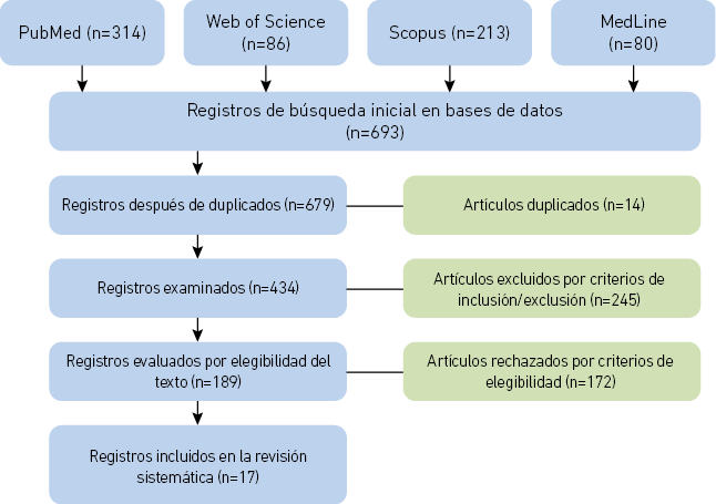 Una vez que concluyó la selección de documentos que aplicaban por los criterios de núcleos temáticos señalados, quedaron en total 434 artículos. Después se analizó la posible presencia de duplicidad de artículos y la idoneidad. Al terminar, se procedió con la revisión minuciosa para determinar la selección de los artículos que cumplieran con los criterios de inclusión y para eliminar aquellos que presentaron al menos uno de los criterios de exclusión. Como resultado de esta acción, se desarrolló un listado con los artículos potencialmente pertinentes para ser incluidos en esta revisión sistemática. Al terminar, se hizo una segunda lectura para confirmar la elegibilidad del artículo y valorar su evaluación bajo los criterios del Centre for Evidence-Based Medicine (2021). De los 693 artículos encontrados inicialmente, la muestra elegible final se conformó de 17 artículos (véase la Figura 1).