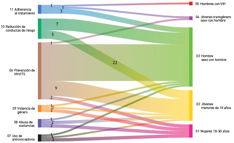 Las problemáticas y temas de salud sexual que se abordaron en las intervenciones fueron diversas y se conformaron de la siguiente manera: el 53 % abordó temas de prevención de VIH/ITS; el 19 % de reducción de conductas de riesgo; el 8 % de adherencia al tratamiento y abuso de sustancias; y sobre el uso de anticonceptivos y violencia de género, el 6 %. También se observó que la edad promedio con la que se trabajó en todos los estudios fue de 21 años, y que el grupo de participantes preponderante fue el de hombres que tienen sexo con hombres. En estos grupos, los temas que mayormente se trataron fueron la prevención de VIH/ITS y la reducción de conductas de riesgo (véase la Figura 2).