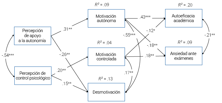 Por otro lado, el apoyo a la autonomía correlacionó positivamente con la motivación autónoma y la autoeficacia académica, y lo hizo negativamente con la percepción de control psicológico, la desmotivación y la ansiedad ante exámenes. La percepción de control psicológico correlacionó positivamente con la motivación controlada, la desmotivación y la ansiedad antes de exámenes, y negativamente con la motivación autónoma, la que a su vez correlacionó negativamente con la ansiedad ante exámenes y la desmotivación, y positivamente con la autoeficacia académica. Además, la motivación controlada correlacionó positivamente con la desmotivación y la ansiedad ante exámenes y negativamente con la autoeficacia académica. La desmotivación correlacionó positivamente con la ansiedad ante exámenes y negativamente con la autoeficacia académica, la que a su vez correlacionó negativamente con la ansiedad ante exámenes (véase Tabla 1).