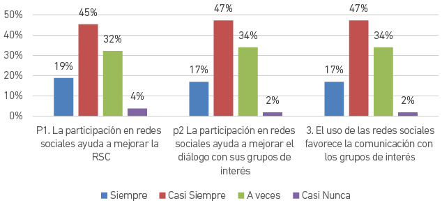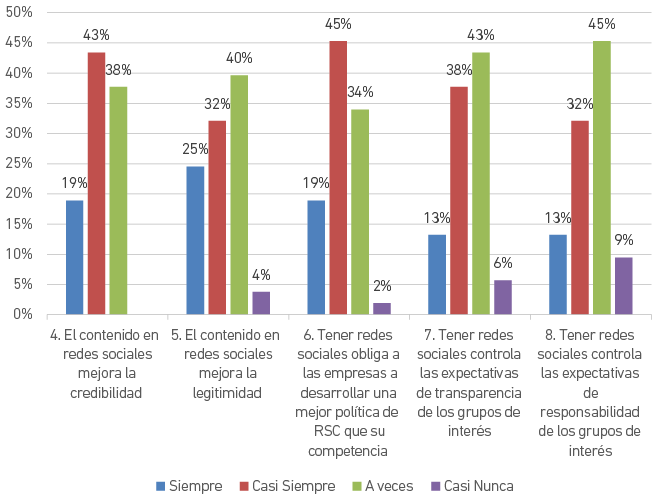 En contraste, un 4 % no considera que el contenido en redes sociales mejore la legitimidad, un 2 % menciona que tenerlas no demanda el desarrollo de mejores políticas de RSC, un 6% no considera que tener redes sociales controle las demandas de transparencia y 9 % piensa que tener redes sociales no controla las esperanzas de responsabilidad de los grupos de interés.