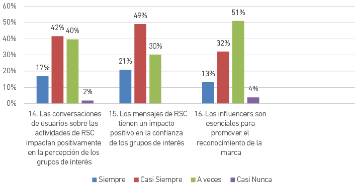 La percepción es favorable a nivel global. Como observamos en la Figura 4, el 59 % de las personas encuestadas señala que el diálogo acerca de las actividades de RSC tienen un impacto positivo en la percepción de los stakeholders y el 70 % considera que los posts de RSC impactan en la confianza. Solo para un 45 % los influenciadores digitales son clave para la promoción y el reconocimiento.