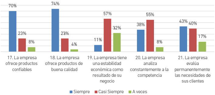 En este caso, la percepción es muy favorable a nivel global. Tal como aparece en la Figura 5, casi todas las personas encuestadas consideran que la empresa ofrece productos confiables (93 %), que la empresa ofrece productos de buena calidad (97 %). y que la empresa analiza constantemente a la competencia (93 %). El 68 % piensa que la empresa tiene una estabilidad económica como resultado de su negocio y el 83% considera que la empresa evalúa permanentemente las necesidades de sus clientes. No se tienen opiniones en desacuerdo sobre esta dimensión.