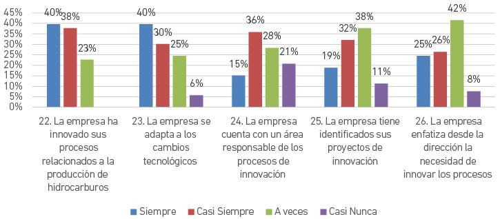 De manera global, la percepción de esta dimensión también es favorable. Como se observa en la Figura 6, el 78 % piensa que la empresa ha innovado sus procesos relacionados a la producción de hidrocarburos, un 70 % considera que esta se adapta a los cambios tecnológicos, un 51 % afirma que la empresa cuenta con un área responsable de los procesos de innovación, un 52 % considera que la empresa tiene identificados sus proyectos de innovación y el 51 % cree que la empresa enfatiza desde la dirección la necesidad de innovar los procesos.
