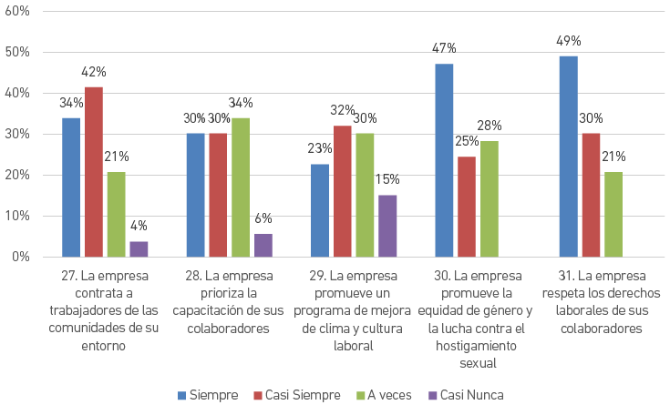 En contraste, el 4 % considera que la empresa no contrata a trabajadores de las comunidades de su entorno, un 6 % cree que la empresa no prioriza la capacitación de sus trabajadores y un 15 % piensa que la empresa no promueve un programa de mejora de clima y cultura laboral.