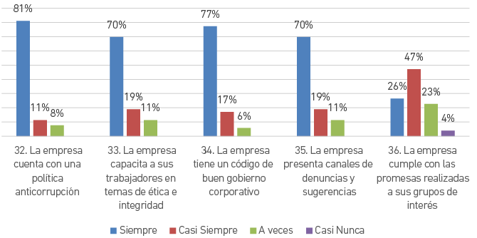 Esta dimensión también se percibe de manera muy favorable. En la Figura 8 puede verse que el 92 % considera que la empresa cuenta con una política anticorrupción, un 89 % sostiene que la empresa capacita a sus trabajadores en temas de ética e integridad, un 94 % cree que la empresa tiene un código de buen gobierno corporativo, un 89 % considera que la empresa presenta canales de denuncias y sugerencias y el 73 % piensa que la empresa cumple con las promesas realizadas a sus grupos de interés.