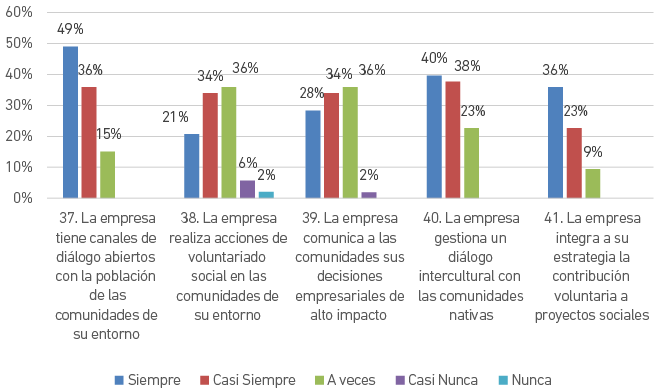 En contraste, el 9 % considera que la empresa no realiza acciones de voluntariado social en las comunidades de su entorno y un 2 % piensa que la empresa casi nunca comunica a las comunidades sus decisiones empresariales de alto impacto.
