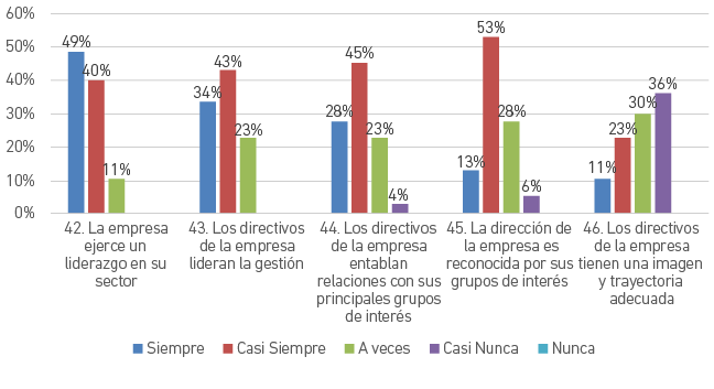 En lo que respecta a la dimensión Liderazgo, se observa en la Figura 10 que el 89 % piensa que la empresa ejerce un liderazgo en su sector, un 77 % considera que la directiva es quien lidera la gestión, un 73 % cree que los directivos entablan relaciones con sus stakeholders, un 66 % considera que son reconocidos por sus grupos de interés, pero solo el 34 % piensa que cuentan con una buena imagen y trayectoria.