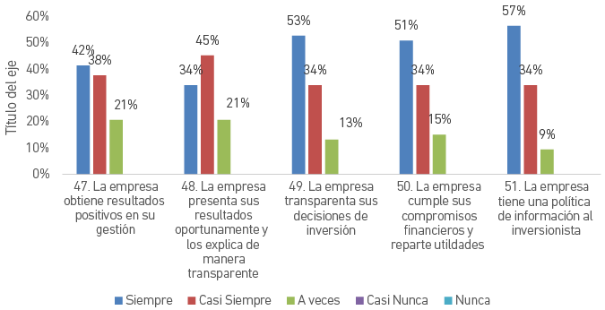 La percepción es muy favorable a nivel global. Como observamos en la Figura 11, el 80 % piensa que la empresa obtiene resultados positivos en su gestión, un 79 % considera que la empresa presenta sus resultados oportunamente y los explica de manera transparente, un 87 % cree que la empresa transparenta sus decisiones de inversión, un 85 % considera que la empresa cumple sus compromisos financieros y reparte utilidades y el 91 % cree que la empresa tiene una política de información al inversionista. No se tienen opiniones en desacuerdo sobre esta dimensión.