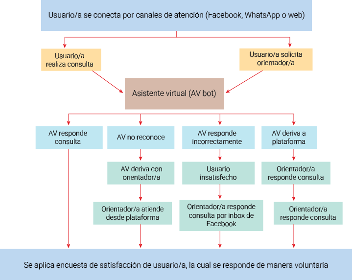 Frente a la dificultad de verificar la comprensión por parte del asistente virtual, los consejeros de SOS monitorean las respuestas del chatbot con el fin de detectar respuestas incorrectas. Las dificultades suelen presentarse debido a la complejidad de las preguntas, porque el usuario fórmula más de una a la vez o porque a veces los usuarios inician su consulta con un relato que el chatbot no logra sistematizar. Este trabajo de monitoreo permite al SOS mejorar el entrenamiento del asistente virtual. De esta manera, el SOS, apoyado en el asistente virtual, desarrolla un proceso de atención a usuarios que requieren resolver una consulta o buscan orientación específica sobre un tema en particular. En este proceso, se presentan cuatro escenarios (Figura 1):