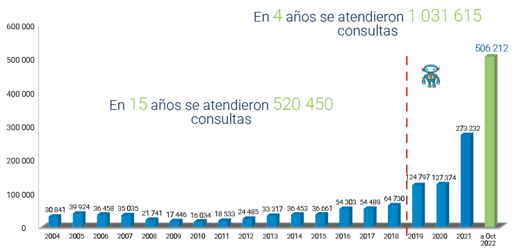 En el 2015, antes de la incorporación de la cuenta de Facebook, las consultas llegaban a 36 661. En el 2016, la cifra llegó a 54 303 y, en el 2018, fueron 64 730 las consultas atendidas.