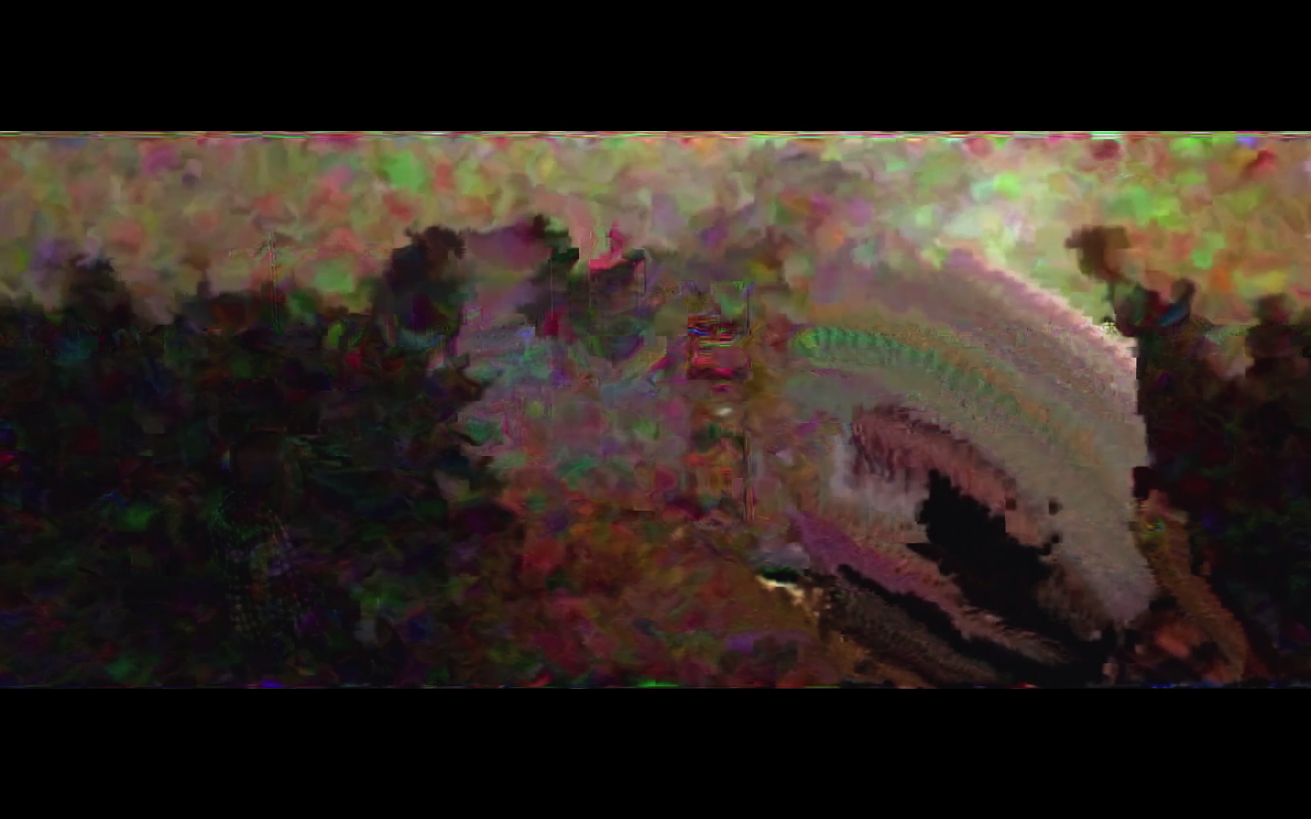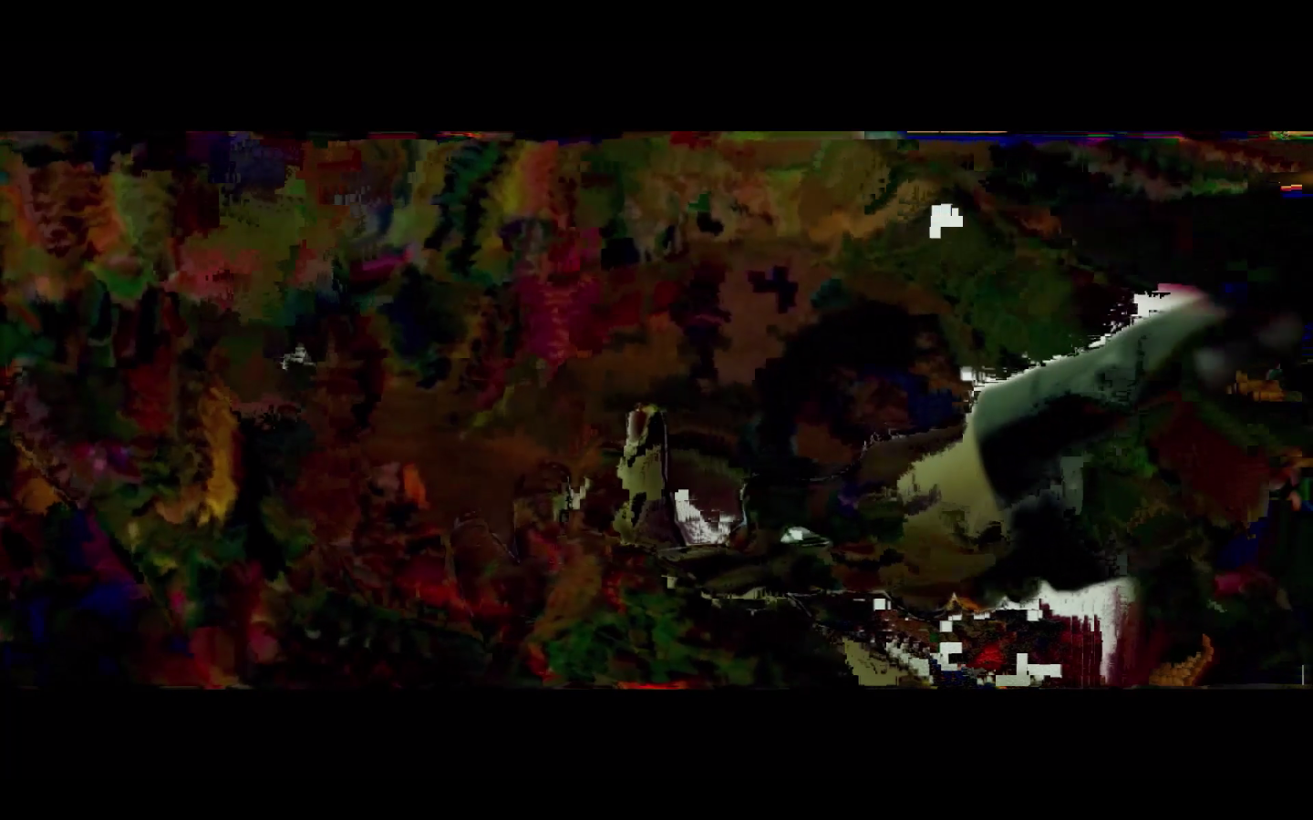 Os glitches e datamoshing se relacionam com o movimento Net Art, arte feita na e para a internet que emergiu na década de 1990 e também alcançou reconhecimento no sistema das artes visuais[xxi] por meio de nomes como a artista russa Olia Lialina e o estadunidense Takeshi Murata. Uma das referências para Videofilia, Monster movie (2005)[xxii], de Murata, tido como um dos precursores do datamoshing, extrai um trecho do filme-B Caveman (1981), em que um monstro emerge de um pântano fervilhante, para decompor sua forma e as cores originais em 30 frames por segundo.
