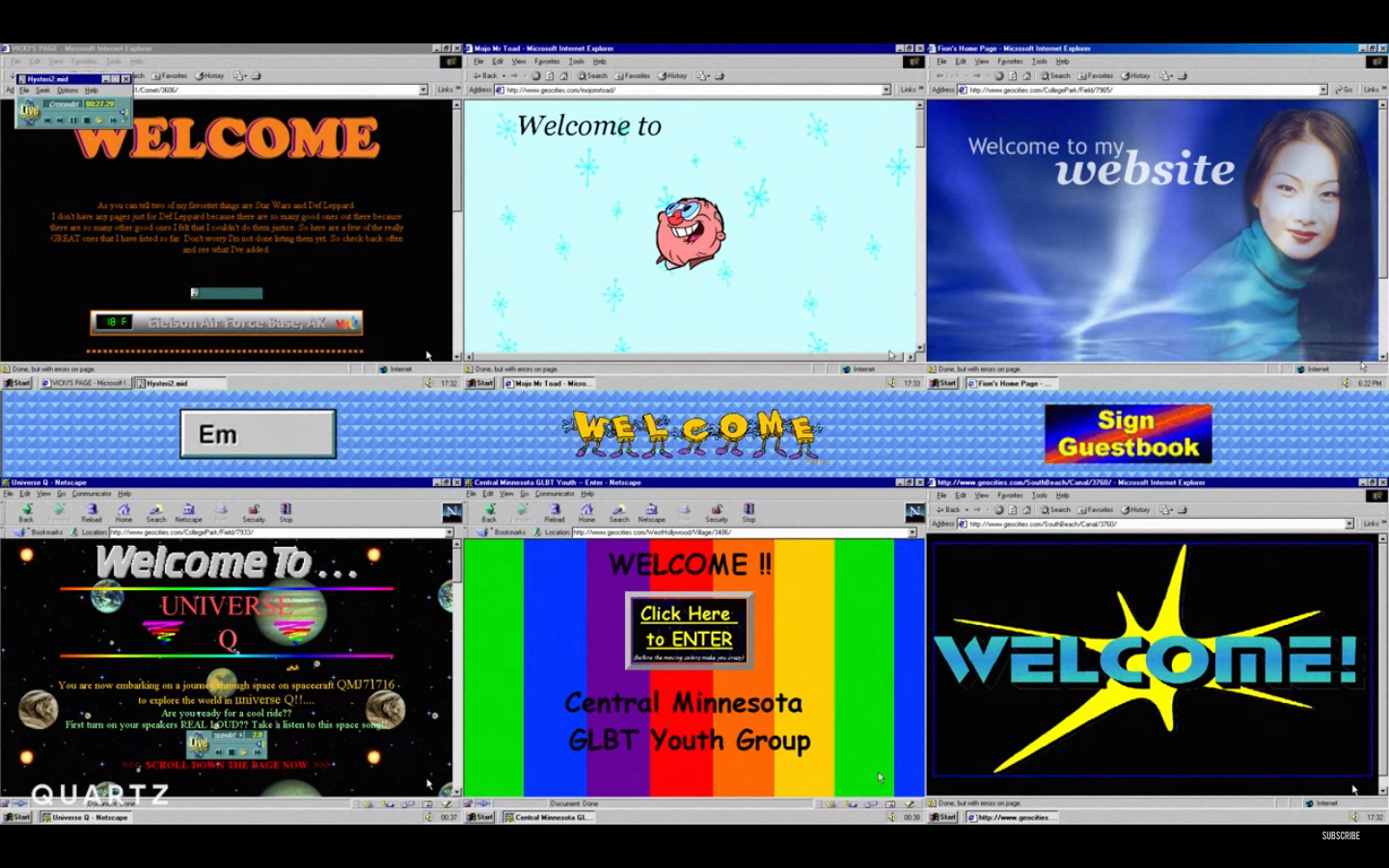Em alguns momentos, a atmosfera gerada pelos GIFs e pop-ups (Figuras 5 e 6) que invadem as cenas ressoa o visual da internet dos anos 1990, inacabada e mais caótica. Ao contrário das plataformas Google atuais – brancas, lisas, acessíveis, supostamente neutras – ou de outros sites cujo layout parece obedecer a um mesmo padrão pré-configurado, as referências da internet anterior são os endereços hospedados via Geocities (Figura 7), em que os usuários, ainda que de maneira simplória, manejavam os códigos de seus próprios sites, tateando coletivamente a construção do que seria a www. Hoje, apesar da facilidade de realizar postagens em redes sociais, o conhecimento para propor alterações estruturais nas páginas é menos difundido.