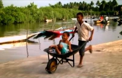 Tinho a observa sério. Olha para as rodas que havia visto antes. Vemos, então, com ele, que se trata de uma cadeira de rodas velha e quebrada. A menina o chama e lhe entrega um desenho: um menino segurando um carrinho de mão ao lado de uma árvore e dois barcos. Não há diálogos. Um sorriso tímido entre os dois. Uma amizade foi iniciada.