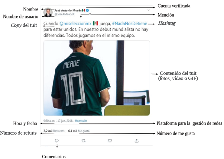 Esta aproximación y exploración del microblog nos permite esbozar una propuesta de análisis del panel de actividad de un tuit. Identifiquemos los ítems que componen el contenido del mensaje: el copy del tuit, el contenido del tuit, los hashtags (#), las menciones (@) y los enlaces (🔗). Por otra parte, los ítems que miden el alcance son el número de comentarios, retuis, me gusta; y, en caso de video, el número de reproducciones. Finalmente, los aspectos generales: nombre, nombre del usuari@, insignia de cuenta verificada, hora y fecha del tuit, y, en su caso, plataforma para la gestión de redes. Todos los elementos anteriormente mencionados componen, en términos generales, un tuit; además, desde una estrategia gemela, analizamos el contenido y el alcance de los mensajes.