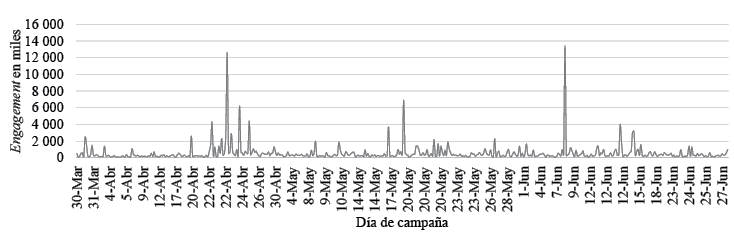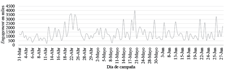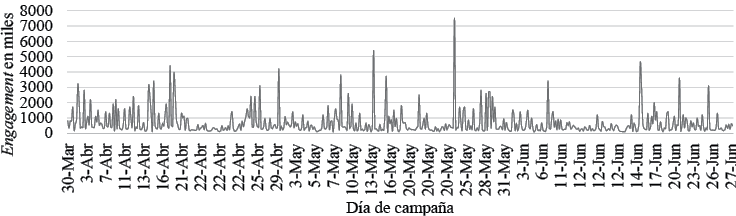 24 Los picos de interacción más altos de la conversación responden a las fechas en las que acontecen los debates, que, como se ha comprobado desde la literatura, provocan un engagement entre las audiencias y los medios digitales (Chihu, 2010, pp. 83-86; Fang et al., 2019, pp. 9-10; Freelon & Karpf, 2015; Khazraee, 2019, p. 9; Larsson & Moe, 2012; Zheng & Shahin, 2020, pp. 352-353, por mencionar algunos).