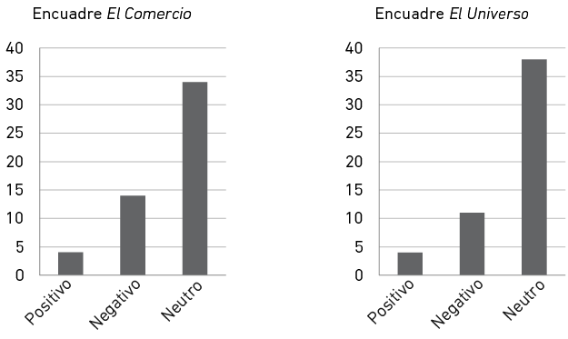 En lo que tiene que ver con el encuadre o framing (Figura 2), y como ocurrirá en general con la totalidad de los resultados en uno y otro medio periodístico, se percibe una notable homogeneidad entre los elementos analizados en El Comercio y en El Universo. Apenas hay diferencias, de lo que se puede inferir una cobertura y consiguiente tratamiento análogos sobre asuntos relacionados con migración y movilidad humana.