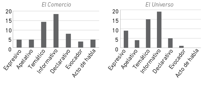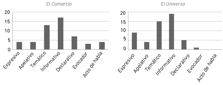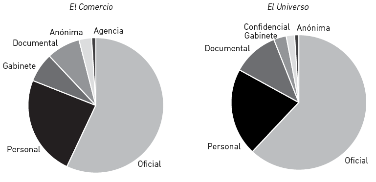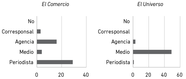 Es importante mencionar que todos los elementos analizados tuvieron firma, a pesar de que, en el caso de El Universo, hay una descomedida utilización de la firma colectiva que puede entenderse como una construcción colaborativa del conocimiento, un “asunto indisolublemente ligado con la calidad de nuestras democracias actuales” (Rizo, 2015, p. 245), o como un trabajo despersonalizado, meramente empresarial, casi de anonimato: al respecto, “Hay que salir siempre del anonimato y dar la cara. Eso es periodismo” (Barbáchano, 2017, p. 1). Además, la firma es una práctica sujeta a los códigos internos de los medios y, en el caso de Ecuador, forma incluso parte de la legislación: la Ley Orgánica de Comunicación señala el deber de “asumir la responsabilidad de la información y las opiniones que difundan” (Asamblea Nacional del Ecuador, 2013, p. 25).