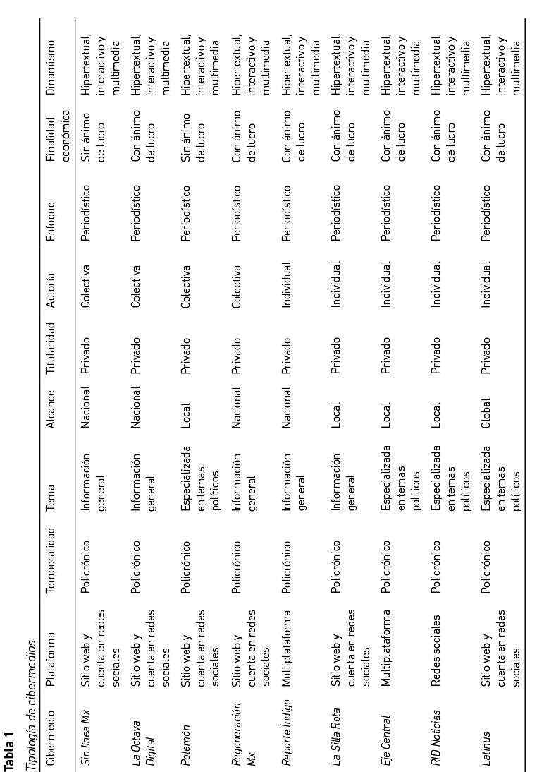 Siguiendo la tipología de Salaverría (2017), la Tabla 1 ofrece una clasificación sobre estos medios. Como puede observarse, salvo en algunos aspectos (tema, alcance, titularidad, autoría y finalidad económica), la mayoría comparte los rasgos más distintivos de un cibermedio (plataforma, temporalidad y dinamismo). Dado que carecen de un soporte físico como los medios tradicionales, estos medios aprovechan al máximo las posibilidades hipertextuales, interactivas y multimedia que ofrece el soporte en línea, por lo que en la mayoría son multiplataformas y multitemporales o policrónicos, lo que significa que ofrecen una actualización continua de las noticias que se producen diariamente en el contexto mexicano.