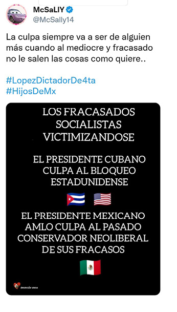 McSaLly [@McSally14]. (2021, 15 de julio). La culpa siempre va a ser de alguien más cuando al mediocre y fracasado no le salen las cosas como [Tweet] [Imagen adjunta]. Twitter. https://twitter.com/McSally14/status/1415685027757580290