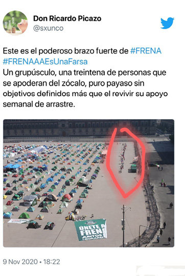 Picazo, R. [@sxunco]. (2021, 15 de julio). Este es el poderoso brazo de #Frena #FRENAAAEsUnaFarsa un grupúsculo, una treintena de personas que se apoderan del zócalo [Tweet] [Imagen adjunta]. Twitter. https://mobile.twitter.com/sxunco/status/1325866370425384980