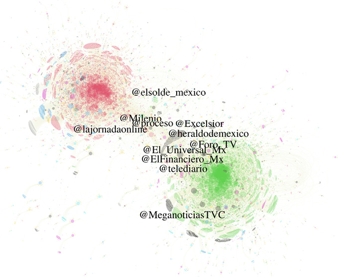 Este estudio respondió a un objetivo específico, analizar si las organizaciones de noticias con presencia en Twitter crean contenidos mediáticos que satisfacen las preferencias de sus electores y cuáles de los dos tipos de medios, tradicionales o digitales, fueron más propensos a satisfacerlas. Eventos sociales como #Frena, muchas veces, irrumpen en el escenario mediático y atraen la atención del público, lo que aumenta el consumo de noticias en línea (Cardenal et al., 2019). El caso muestra una red dividida en dos comunidades y estructurada alrededor de demandas contrapuestas. Por una parte, los simpatizantes de Frena que exigen la renuncia del presidente de México; por la otra, los partidarios del presidente construyendo narrativas que contrarrestaban aquella petición.