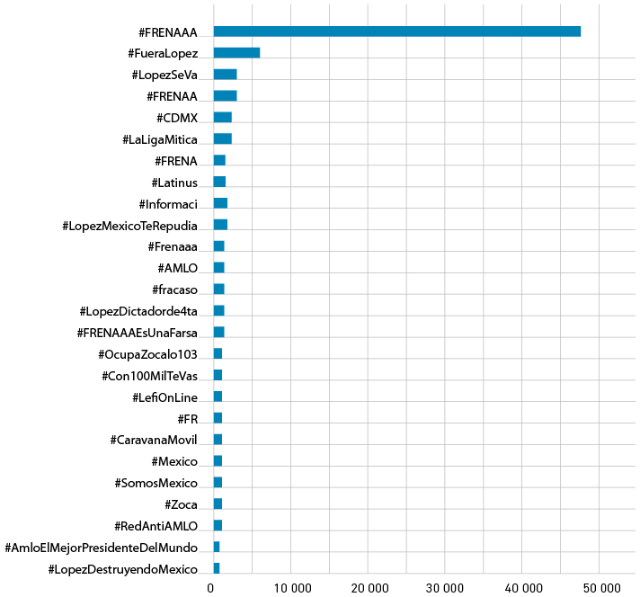 Si miramos la frecuencia con la que se compartieron los hashtags en esta red, la Figura 3 muestra algunas de las más difundidas por los usuarios de ambas comunidades. #FueraLopez, #LopezSeVa, #LopezMexicoTeRepudia, #fracaso y #LopezDestruyendoMexico fueron las que más resonaron en el sector afín a Frena. Estas etiquetas sirvieron para encuadrar diferentes temas desde la situación económica del país hasta la inseguridad y el manejo de la pandemia. Otras etiquetas que circularon masivamente calificaban al presidente de dictador al estilo de los Castro en Cuba, como #LopezDictadorde4ta (véase la Figura 4).