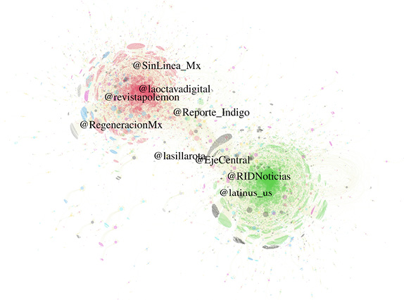 En la Figura 7 se ubican los medios digitales cuyos enlaces fueron embebidos en ambas burbujas. Los usuarios que se ubican del lado de la oposición (rojo) insertaron hipervínculos de fuentes alternativas como @SinLinea_Mx, @laoctavadigital, @revistapolemon y, en menor medida, @RegeneraciónMx, @Reporte_Indigo y @lasillarota. Por su parte, los usuarios que se ubican del lado de Frena (verde) insertaron con más frecuencia enlaces de @RIDNoticias, @latinus_us y, con menor frecuencia, de @EjeCentral y @lasillarota.