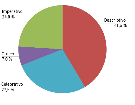 Permite analizar si el influencer se expresa sobre la situación, acción o noticia con un tono neutro (descriptivo); si lo hace con enfado, tono negativo o crítico (crítico); si se festeja una acción, noticia o situación (celebrativo); o se hace un llamado a la acción (imperativo). Si bien estas subcategorías se inspiran en el trabajo de Eggins y Slade (1997), la denominación obedece a una categorización inductiva que parte del contenido analizado.