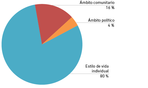 La variable ámbito del desarrollo del tema revela que predominan ampliamente las publicaciones que sitúan la respuesta deseable al problema ambiental en el estilo de vida individual (160 de 200 publicaciones): decisiones a nivel doméstico, de rutinas y de consumo. En segundo lugar, se encuentran las que lo ubican en el ámbito comunitario (32 publicaciones); las que implican un trabajo o esfuerzo conjunto a nivel social para promover, poner en práctica o resistir/cuestionar una acción con impacto en el ambiente. Marginalmente, aparecen las publicaciones sobre la respuesta al problema ambiental enfocadas en el ámbito político (8 publicaciones) asociadas a la esfera política institucionalizada (véase la Figura 4).