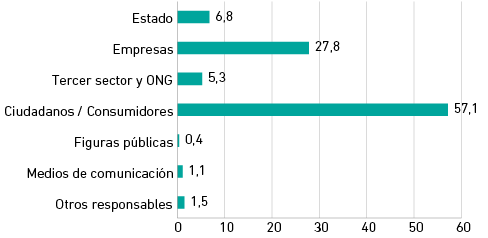 Identifica los actores a quienes los influencers endilgan algún tipo de deber de actuación ante la situación expuesta. En línea con investigaciones previas (Bickerstaff et al., 2008; Clarke & Agyeman, 2011; Eden, 1993; Gómez-Márquez, 2021), se releva la responsabilidad asignada al Estado, a las empresas, al tercer sector y a las ONG, a las figuras públicas, a los ciudadanos/consumidores o a los medios de comunicación.