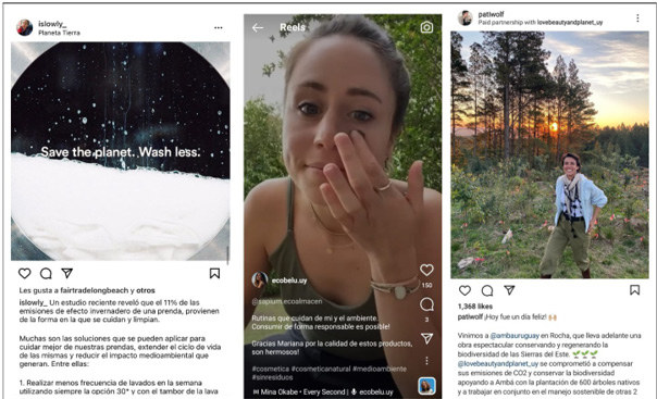 Nota. La Figura 3a es adaptada de “Un estudio reveló que el 11 % de las emisiones de efecto invernadero de una prenda, provienen de la forma”, por islowly_, 18 de febrero del 2022, Instagram. La Figura 3b es adaptada de “Rutinas que cuidan de mí y el ambiente. ¡Consumir de forma responsable es posible!”, por ecobelu.uy, 5 de octubre del 2021, Instagram. La Figura 3c es adaptada de “¡Hoy fue un día feliz!”, por patiwolf, 31 de agosto del 2021, Instagram.
