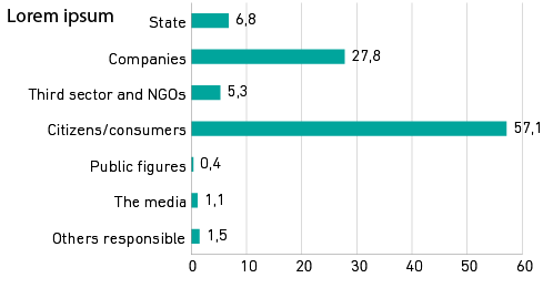 Therefore, the representations and relationships that make up the meaning of the environmental problem for influencers point to individuals. The trend is confirmed when the attributions of responsibility for the environmental crisis are analyzed (see Figure 5). Although influencers do not always saddle identifiable actors or stakeholders with some duty to act in the face of the exposed situation, the most frequently referred to are citizens or consumers. In a distant second place are the companies and the State at last.