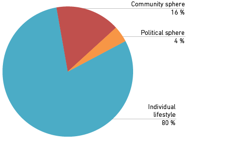 The Domain of Topic Development variable reveals that the publications that place the desirable response to the environmental problem in the individual lifestyle predominate widely (160 of 200 publications), poiting to domestic routines and consumption decisions. In the second place, some are set in the community sphere (32 publications), which implies a joint work or effort at a social level to promote, put into practice or resist/question an action impacting the environment. Finally, on the margins are publications on the response to environmental problems focused on the political domain (8 publications) associated with the institutionalized political sphere (see Figure 4).