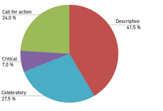 It allows analyzing if the influencer expresses himself or herself about the situation, action or news with a neutral tone (Descriptive ); if he or she does it with anger, a negative or critical tone (Critical); if an action, news or situation is celebrated (Celebrative); or a call to action is made (Imperative). Although these subcategories are inspired by the work of Eggins and Slade (1997), the labels obey an inductive categorization that starts from the content under scrutiny.
