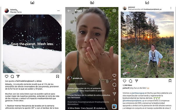 Note. Figure 3a is adapted from A study revealed that 11 % of a garment’s greenhouse emissions come from how it is washed and cared for, by islowly, 2021, Instagram. Figure 3b is adapted from Routines that take care of me and the environment. Consuming responsibly is possible!, by ecobelu.uy, 2021, Instagram. Figure 3c is adapted from Today was a happy day!, by patiwolf, 2021, Instagram.
