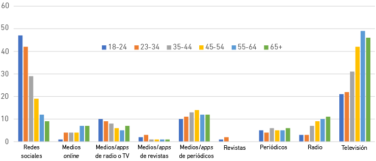 Además, se incrementa el consumo por medio de redes sociales (43 %, cuatro puntos más) y agregadores (18 %, tres puntos más) frente al estancamiento del acceso directo a webs y apps de medios (25 %, baja medio punto). La mitad de los usuarios priorizan el acceso mediante algoritmos (redes sociales, 30 %; agregadores, 10 %; búsquedas de temas, 10 %) frente a la marca de los medios (35 %) (Negredo, 2022). Las principales fuentes de acceso a noticias, en las diferentes franjas de edad, son las redes sociales y la televisión (véase la Figura 2).