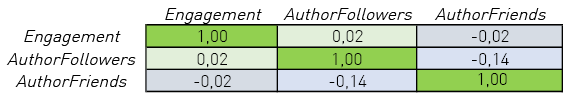 Las cuentas de Twitter de los diarios regionales presentan, pues, mejores resultados en lo que se refiere a confianza e influencia que las cabeceras nacionales, a pesar de que estas cuentan, en su versión papel, con un área de influencia territorial más amplia, más suscriptores digitales y un área de influencia territorial mayor. Constatamos también que la correlación entre el número de seguidores (AuthorFollowers) y el engagement es ligeramente positiva, pero no determinante, como tampoco lo es el número de cuentas seguidas.