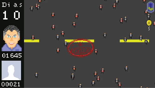 Cada clic muestra un sello con la inscripción despedido que se estampa sobre los pequeños sprites que recorren el espacio. Todas las personas que quedan bajo el sello se suman al marcador como despedidos. Hay power ups, elementos propios del videojuego que permiten incrementar durante un breve tiempo las destrezas y habilidades disponibles, que en Decretator se presentan bajo la forma de contenidos informativos que se agregan de forma paródica al juego y ayudan a incrementar la velocidad y la escala de los despidos. Si se cliquea en el logo de la Policía aparece un cordón policial que barre la escena de izquierda a derecha. El recurso remite satíricamente al uso de las fuerzas de seguridad por parte del Gobierno para limitar las protestas. De manera muy interesante, la mecánica permite despedir también a los policías si se clica sobre ellos. Otro power up consiste en acertar en los globos amarillos, asociados a la simbología del partido PRO7, que pasan rápidamente por la pantalla en momentos azarosos. Si se consigue clicarlos, un sello que dice DNU (Decreto de Necesidad y Urgencia8) ocupa la pantalla y todos los manifestantes visibles son despedidos (véase la Figura 1). Por último, si se clica en la imagen de la vicepresidente que aparece aleatoriamente, se sobreimprime un cartel que dice “Revolución de la Alegría” y, acto seguido, una gran cantidad de manifestantes en la calle cambian de colores y se suman a los despedidos como si tomaran para sí el ideario del partido de Gobierno.