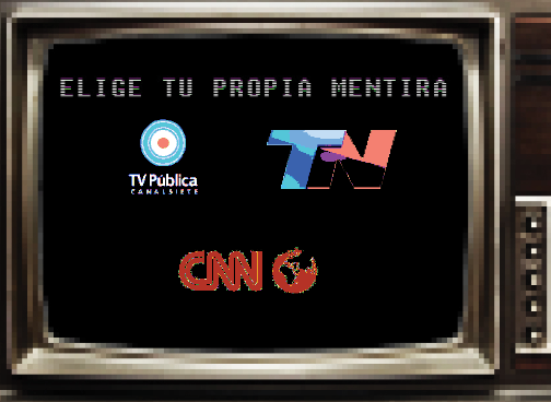 Al iniciarse, Suicid.ar presenta un texto de descargo que abre ya algunos focos satíricos: “Los hechos y personajes en este videojuego son pura ficción, al igual que las noticias que ves en televisión. Cualquier similitud con la realidad es pura coincidencia”. La frase dirige la satirización hacia el periodismo televisivo, en especial, contra el género del noticiero, en tanto se representa una TV de tubo catódico que enmarca el juego y que plantea, además, una relación crítica entre la producción de agenda de las cadenas de noticias y los géneros ficcionales que cuestionan así el estatuto de realidad asociado a los contenidos periodísticos y les atribuyen, entonces, mecanismos de elaboración propios de la ficción. En el momento previo al inicio de la partida, se ofrecen coordenadas temporales: “19 de enero. 2015. Argentina. 7 AM” (es el momento en que se conoció la noticia). Luego siguen algunas capturas de noticieros de ese día, reconstruidos con una estética de 8 bits y colores distorsionados, que parodian la cobertura mediática. En la pantalla que sigue se pide al jugador que tome la decisión más importante del juego, la que determinará su experiencia lúdica. Bajo la consigna “Elige tu propia mentira” (que reenvía en clave paródica a la serie de libros Elige tu propia aventura), se ofrecen los logos de la TV Pública, el canal Todo Noticias (TN) y la cadena internacional CNN. Cada uno de los canales (re)construye de manera paródica una cobertura mediática que refiere a las conjeturas sobre el caso y trabaja, mediante la exageración, con sesgos asociados a cada medio.