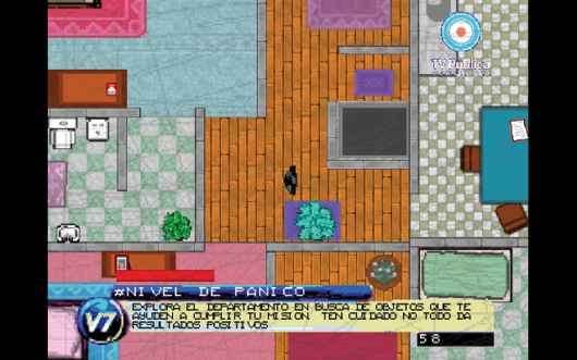 La posición satírica de Suicid.ar se completa en una pantalla que concluye la experiencia al evaluar si el jugador cumplió con el objetivo propuesto. Además de la ejemplificación, opera también la retórica del fracaso ya conceptualizada (Bogost et al., 2010). El objetivo es salvar a Nisman, pero no importa cuál sea el desempeño del jugador: el fiscal siempre terminará muerto. Cuando el usuario elige la TV Pública, el juego termina con el fiscal suicidándose. Esto ocurre al interactuar con objetos que lo estresan: una barra sobre el zócalo televisivo señala su nivel de pánico, el que se incrementa a medida que pasa el tiempo y el contacto con elementos del entorno (véase la Figura 4). Si el usuario elige TN, el fiscal corre al baño y se suicida apenas ve al asesino que controla el jugador sin importar si el usuario cumplió con las tareas requeridas. En la secuencia de la CNN, el asesino controlado por el usuario mata al fiscal en la habitación del departamento donde lo encuentra. En las tres opciones, la conclusión propone una lectura burlona y crítica sobre el rol de los medios en la construcción pública de los hechos. La interpretación propuesta por el juego habilita formas de reflexión en torno al suceso, su mediatización y, especialmente, sobre su inscripción en diferentes narrativas propias de los géneros del periodismo.