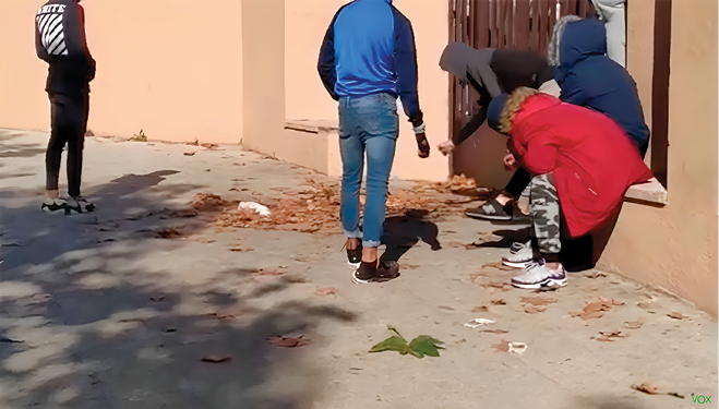 Las imágenes de los vídeos están creadas con diferente material, desde entrevistas realizadas en las calles a vecinos de barrios que conviven con centros de menores no acompañados, hasta discursos del propio líder del partido y otros compañeros, como Rocío Monasterio. Se encuentran dos tipos de relación entre el texto y la imagen. La primera es una relación de redundancia, en la que se va mostrando lo que el discurso puramente lingüístico va narrando; en concreto, lo negativo, el miedo (Vox España, 2018; Vox España, 2019a; Vox España, 2019b; Vox España 2021b). Un ejemplo muy explícito es cuando Rocío Monasterio señala los peligros de tener un centro de menores extranjeros no acompañados en el barrio y, a la vez, se muestran vecinos dañados (Figura 3) y reuniones (Figura 4). Así, se aporta una representación visual tanto de las amenazas como de las consecuencias.