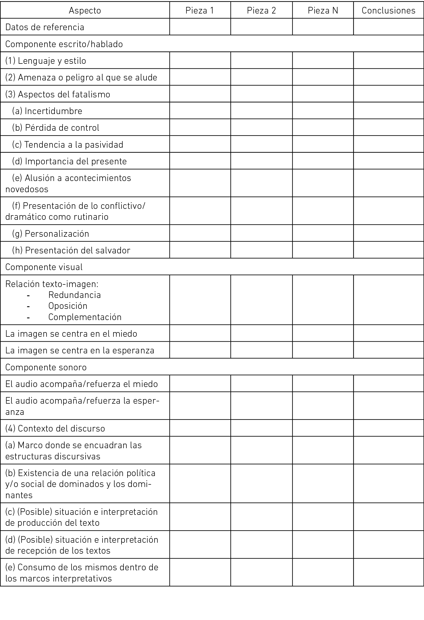 Si bien es cierto que los estudios que analizan el fatalismo lo abordan desde la disciplina de la psicología centrándose en la recepción (por ejemplo, Vallejo Marín et al., 2016), aquí se plantea estudiar los propios discursos que incitan a crear una atmósfera, o a hacer creer en ella, en la que predomina la incertidumbre, la inseguridad y el miedo, con el objetivo de obtener rédito político. Para ello, se utiliza como base el enfoque metodológico de análisis crítico del discurso (ACD) bajo la óptica de Van Dijk (2003), el cual entiende que el discurso es un conjunto de prácticas sociales que guían el uso del lenguaje y que, irremediablemente, están condicionadas a las ideologías de los emisores —cuestión vertebral para la propaganda, pues su contenido es ideológico (Pineda, 2006)—. En este caso, se ha creado una hoja de análisis compuesta por cuatro niveles de estudio. El primero tiene relación directa con la propuesta de Fairclough (1992; 1995), pues se analizan las cuestiones formales y lingüísticas como el léxico o el estilo; al fin y al cabo, el miedo se ha convertido en parte del lenguaje (Farré Coma, 2005). El segundo nivel se centra en la alusión a una amenaza/peligro. El tercero identifica los aspectos característicos del fatalismo. Según Martín Baró (1989), Blanco y Díaz (2007) y Bauman (2021), son: