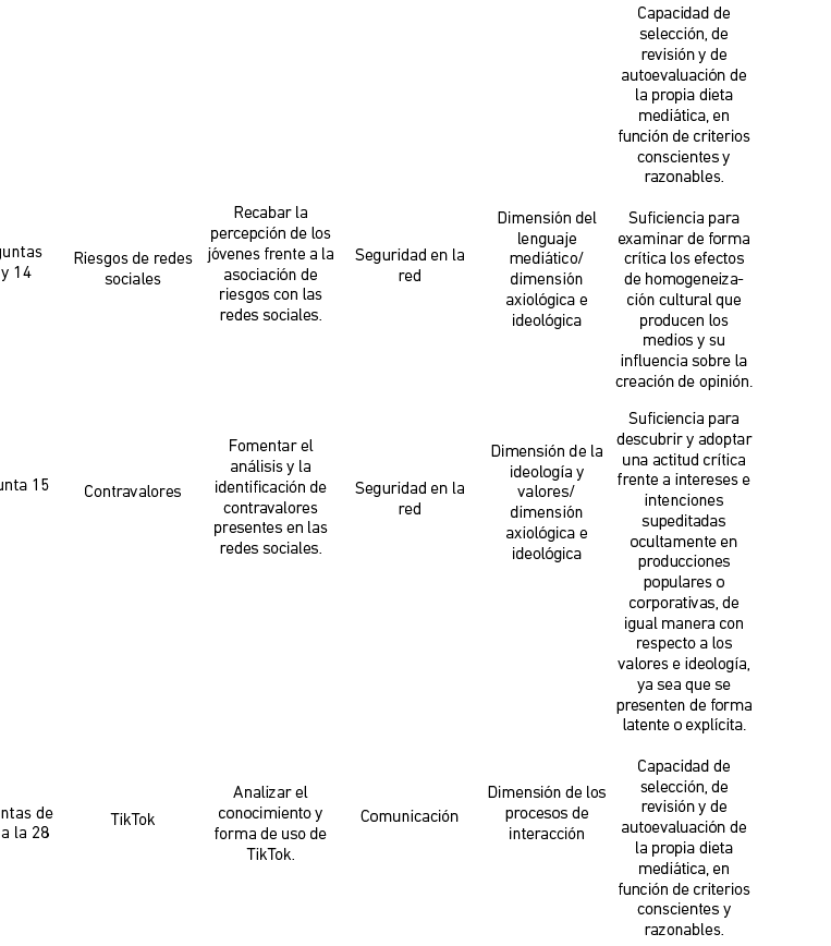 El planteamiento de las preguntas presentadas se basa en que el uso de redes sociales no es garantía de competencia mediática (Aparicio González et al., 2020; Area et al., 2012; Livingstone & Helsper, 2007; Marín-Gutiérrez et al., 2019; Marín-Gutiérrez et al., 2020).