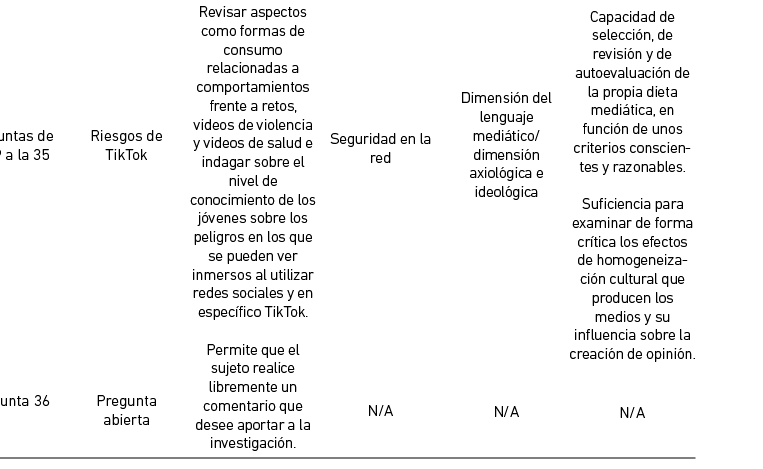 La herramienta planteada es la etapa inicial de una investigación sobre la competencia mediática de jóvenes. Se considera que esta herramienta será útil para establecer el nivel de competencia mediática cognitiva de los sujetos frente a los retos peligrosos de TikTok y los riesgos de redes sociales. De igual manera, para entender sus comportamientos frente a contenidos no adecuados, lo que posibilitará indagar más profundamente en la siguiente etapa de evaluación, para luego establecer programas de alfabetización mediática eficientes y necesarios de acuerdo a lo expuesto por Astuti (2021); Lotero-Echeverri et al. (2018); Pérez-Tornero et al. (2018); Rosenzweig (2017) y McGrew et al. (2017).