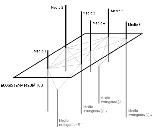 En resumen, un medio nunca está solo. Es solo un actor de un ecosistema complejo poblado por muchos otros medios que atraviesan diferentes fases de su ciclo vital. Del mismo modo, los medios no pueden analizarse de manera aislada: las características y la evolución de un medio dependen en buena parte de las relaciones que establece con otros medios. La intermedialidad es un conjunto multidimensional de relaciones que pueden afectar los discursos de los medios, sus soportes materiales o las instituciones que orbitan a su alrededor. En cuanto a los diferentes tipos de relaciones intermedias, cualquier estudio debe considerar que la intermedialidad encarna la doble lógica de la continuidad y el cambio. Un concepto como el de remediación, en su doble dimensión de inmediatez e hipermediación, ha sido de gran utilidad para enmarcar estas continuidades y discontinuidades. La construcción de un mapa completo y exhaustivo de las relaciones intermediales es todavía una tarea pendiente para la teoría evolutiva de los medios. Cuando todas las relaciones intermediales se superponen, lo que emerge es una red que rompe con cualquier concepción lineal del cambio mediático. Más que una línea de tiempo caracterizada por una secuencia de dispositivos o por un árbol que se bifurca, la evolución mediática es una red compleja de actores, relaciones y procesos.